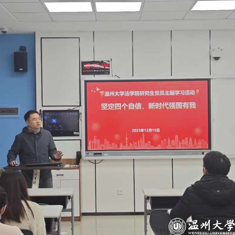 12月15日晚,支部书记白老师给我们讲授了习近平法治思想主题党课之“四个自信”专题。“四个自信”,是指中国特色社会主义道路自信、理论自信、制度自信、文化自信,由习近平总书记在庆祝中国共产党成立95周年大会上提出,是对党的十八大提出的中国特色社会主义“三个自信”的创造性拓展和完善。“四个自信”是一个有机统一体,既相对独立,又相辅相成。之后,我们一起观看了一段描绘大凉山深处通往幸福的“扶贫列车”的视频,其中我了解到中国的铁路不只有速度,还有温度。人民通过自己的双手努力致富,只有每个小家庭都过上了小康生活,方能实现全面脱贫,国家才能真正富强起来。最后,白老师叮嘱我们,“新时代强国有我”,我们作为新时代青年党员,需要在社会中持续发光发热,为国家建设贡献自己的力量。