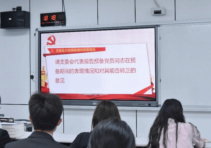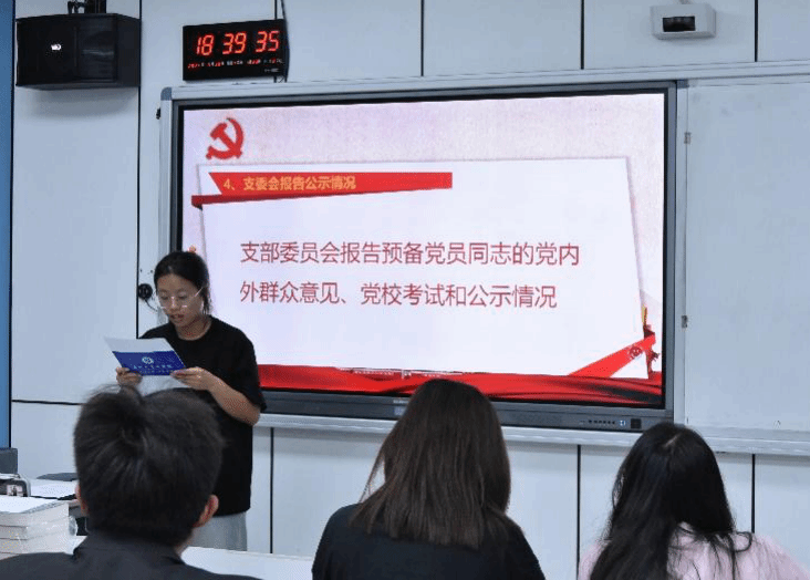 会议第四项流程,各支部委员会代表报告预备党员的公示情况,包括党校考试成绩,群众评价意见,宗教信仰情况等等,体现了预备党员们在加强理论学习的同时,也能脚踏实地,深入群众,树立党员的良好威信与形象。