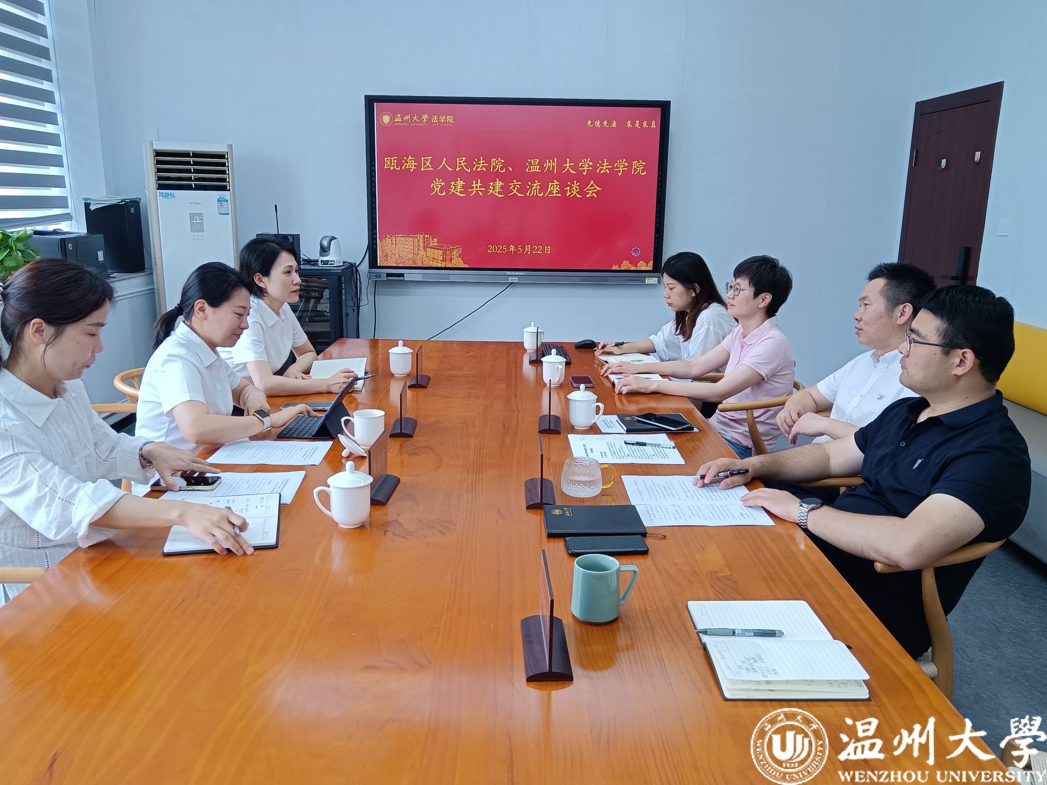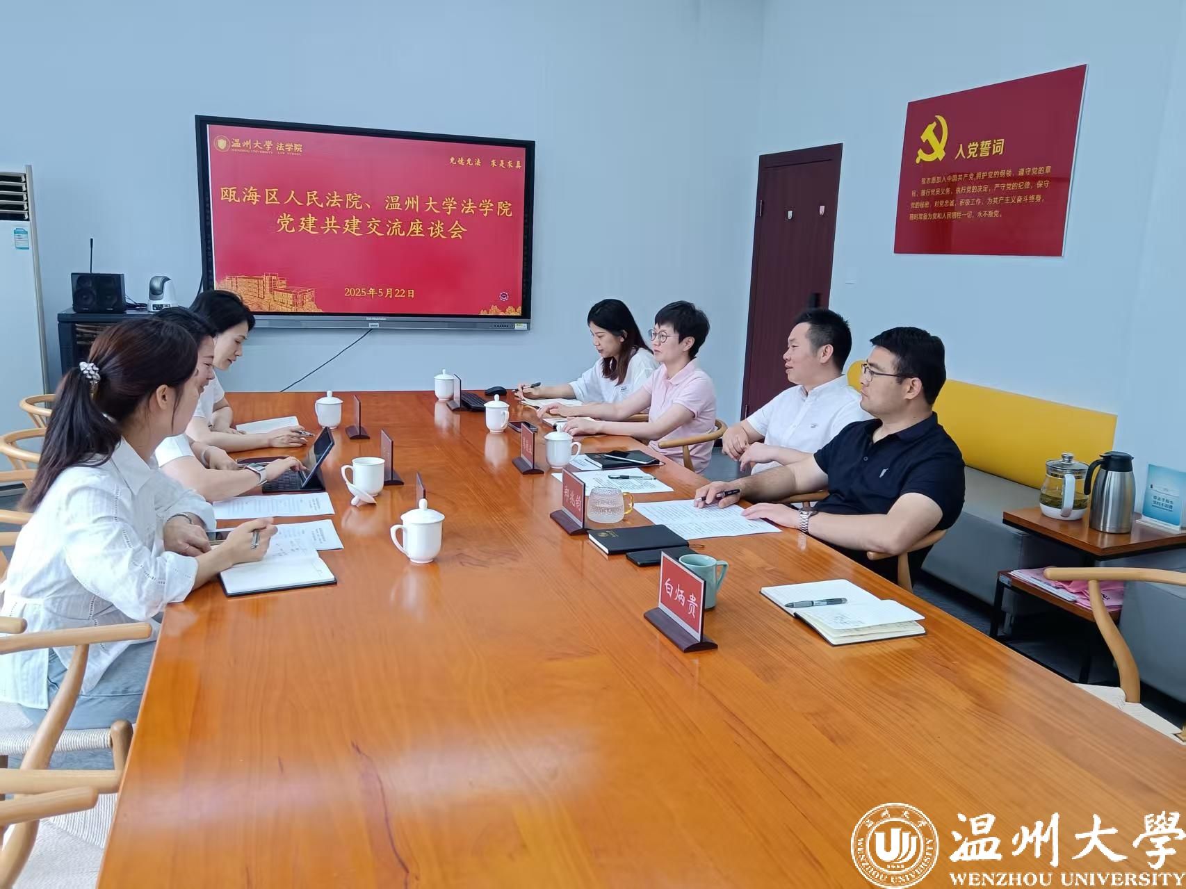 为深入学习贯彻党的二十届三中全会精神,深化党建引领作用,推动司法实践与法学教育深度融合,5月23日上午瓯海区人民法院政治部主任王克,仙岩人民法庭庭长王群英等一行来看片狂人 开展党建共建交流活动。学院党委书记周敬业、副院长周一颜、党委副书记郑兆钧等参加活动。
