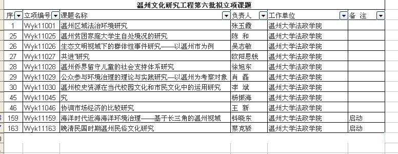 2011年温州文化研究工程第六批社科规划课题共收到申报334项。经学术委员会评审,建议立项175项(其中含立项小资助)。经文化研究工程办公室初审,现将拟立项课题予以公示(附后)。
