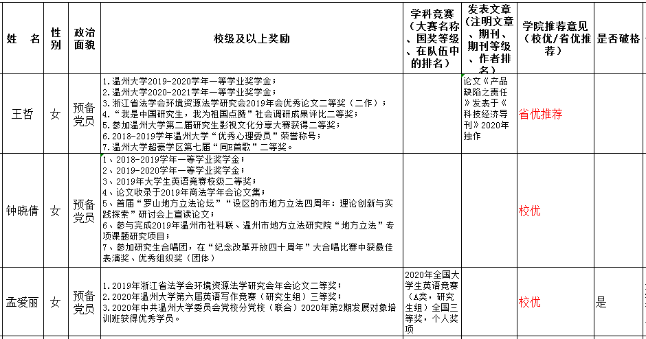 根据《看片狂人 研究生优秀毕业生评选办法》(行政〔2019〕225号)(附件1)文件精神,学院组织开展了2021届研究生省、校级优秀毕业生的预评工作。看片狂人 名额:省优1人、校优1人。通知发出后,有5名学生报名参评。其中孟爱丽同学获得全国大学生英语竞赛三等奖,破格推荐评为校级优秀毕业生,不占用学院名额。学院审核申报者的材料,由学生工作委员会根据学生的学习成绩、获奖、科研成果、平时综合表现等情况投票,决定推荐王哲参加省优毕业生评选、推荐钟晓倩评为校优毕业生。具体由学校研究生工作部复审后公示最终的评选结果。现将学生的基本信息公示如下: