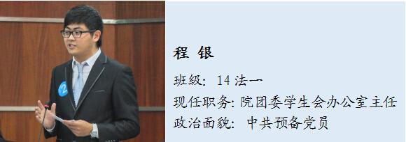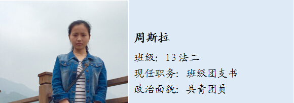 学习刻苦,成绩优异,先后综合排名为专业第6和第1,德智体美劳全面发展,至今已经获省级、市级、校级、区(院)级各类奖项30余项。作为法政团委学生会办公室主任和溯初学区溯宁楼义工队队长,我热情地服务师生,出色地完成了每一次工作。注重学习和实践,主持了校思政风采大赛、校心理健康教育活动节。热心公益,现为看片狂人 社会工作协会负责人,关爱留守儿童,配合市司法局、侨联出品宣传微电影,受到多次市级表彰。