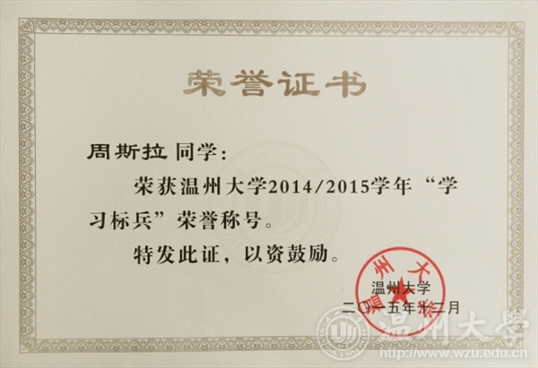 2015年12月,看片狂人 学生处在全校范围组织开展2014-2015学年"学习标兵"评选活动,看片狂人 周斯拉、程银两位同学荣获看片狂人 2014-2015学年"学习标兵"称号。本次共有全校14个学院推荐学优秀学生参评,共评出18位"学习标兵"。本次评选,首先由各学院推选优秀学生参加校级评比,校级评比以现场事迹展示和答辩方式进行,教师代表和各学院派出的学生代表担任评委。