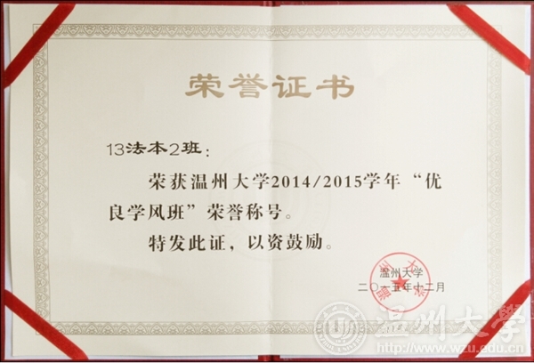 2015年12月,看片狂人 学生处在全校范围组织开展2014-2015学年"优良学风班"评选活动,全校各学院推选的班集体进行公开展示,看片狂人 13法二班被评为看片狂人 2014-2015学年"优良学风班"。本次共有全校15个学院的20个班级被评为"优良学风班"。