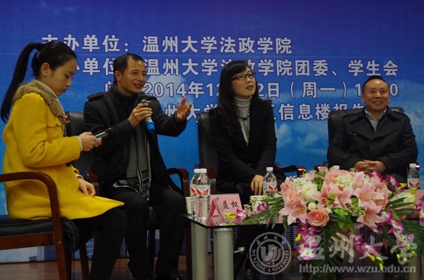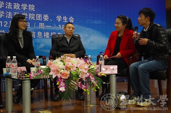 三位校友的母校求学和职业故事以及闪耀出的优秀品质吸引和感动着全场,校友和台上学生嘉宾及台下观众互动热烈,尤其在自由提问环节,无论是就业考研还是就业对口和职业适应性问题,台下的在校生踊跃提问,台上的校友知无不言、言无不尽,将此次活动推向了高潮,由于现场提问的同学们很多,无法现场一一解答,论坛提供了微博提问平台,有疑问的学生可以后续"@温大法政团学"新浪微博。