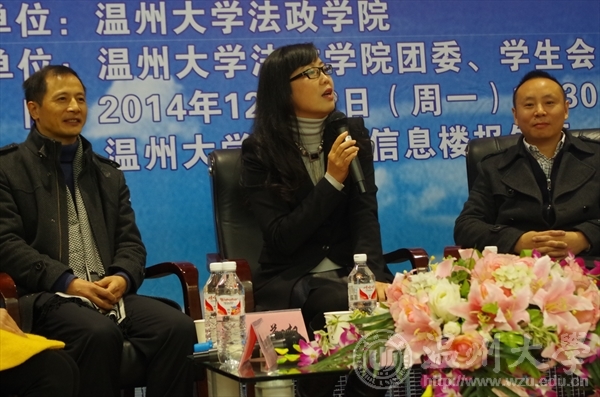 本期论坛邀请了法政学院三位优秀院友、89级入学93届毕业的同班同学作为嘉宾,分别是温州市经济技术开发区司法分局吴林勇局长,温州实验中学黄慧副校长,校党委委员、组织部部长方益权教授。同时邀请了13法学班周斯拉、12行管班沙涛两位在校生嘉宾,同台共话大学学业和职业生涯规划。法政学院党总支书副书记严玲红、学生科副科长孙德升及白昌科等老师出席,学院260多位学生踊跃参加本期论坛活动,台下座无虚席。