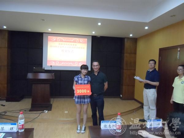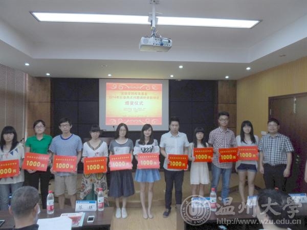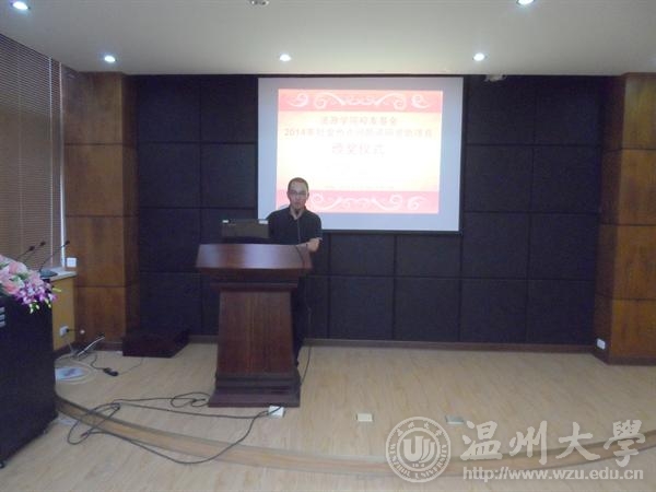 仪式由王柏民书记主持,他在对2014法政校友基金资助项目的评选情况作了详细说明后,宣布了2014法政校友基金资助项目名单。经法政校友基金第一届理事会2014年年会审议,本次法政校友基金奖励资助"新苗奖"B类项目10项(每项资助1000元),"新苗奖"A类项目10项(每项资助2000元),本次获得"精英奖"奖励资助的是2013年浙江省挑战杯决赛二等奖获奖学生团队(陈希特、张翼鹏、卢姗、朱玉婷、裴代娣、黎荣翠,指导老师陈宝胜、朱美宁)。张炘副理事长、谢忠旭副理事长分别为新苗奖B类和A类项目负责人颁奖,陈瑛理事长为精英奖负责人颁奖。随后,法政校友基金理事会陈瑛理事长发表了重要讲话。陈瑛校友从学长的角度,以自己的切身感受对在校的大学生学弟学妹们提出了殷切希望。他认为通常我们说知识改变命运,但实际上,让知识转化为能力的是实践,希望大家都能把社会实践作为十分重要的学习方式,读万卷书,行万里路,在实践中结识并获得"高人"的指点,在实践中培养自己良好的思维习惯、行为习惯和性格品德,努力成为德才兼备的卓越的法政毕业生。