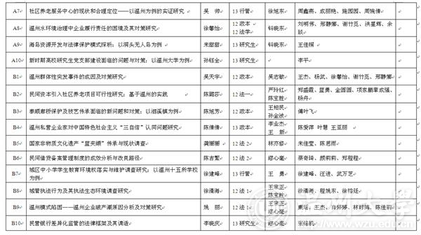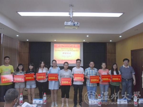 月10日下午,2014法政校友基金资助项目公布暨颁奖仪式在法政楼一楼报告厅隆重举行。法政校友基金理事会陈瑛理事长、谢忠旭副理事长、张炘副理事长和法政学院钭晓东院长、王柏民书记、王宗正副院长出席,学生科科长孙德升和全体获奖项目团队学生参加仪式。