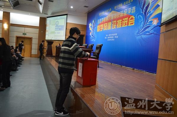 参加此次特色班评选活动的6个班级代表依次上台通过幻灯片展示本班在学风建设、党团建设、素质拓展以及科技创新等方面的建设情况,展示中每个班级各有特色,但也不乏共同成绩:班集体凝聚力强、和谐稳定,学风严谨,学习气氛浓厚,学习成绩优良。各班级的精美幻灯片展示和精彩陈述让台下观摩的师生掌声不断。最后,钭晓东院长宣布经280位师生现场投票,根据得票数高低,11行管、12政本、12法一、11政本、11法二5个班级最终胜出获选法政学院第六届特色班级荣誉称号。院领导钭晓东、王柏民、王宗正、严玲红向获奖班级颁发荣誉证书和班级建设奖金。计票环节,学院获选校学习标兵的郑盛霞和金娅莉同学还分别介绍了自己的学习方法和心得体会。