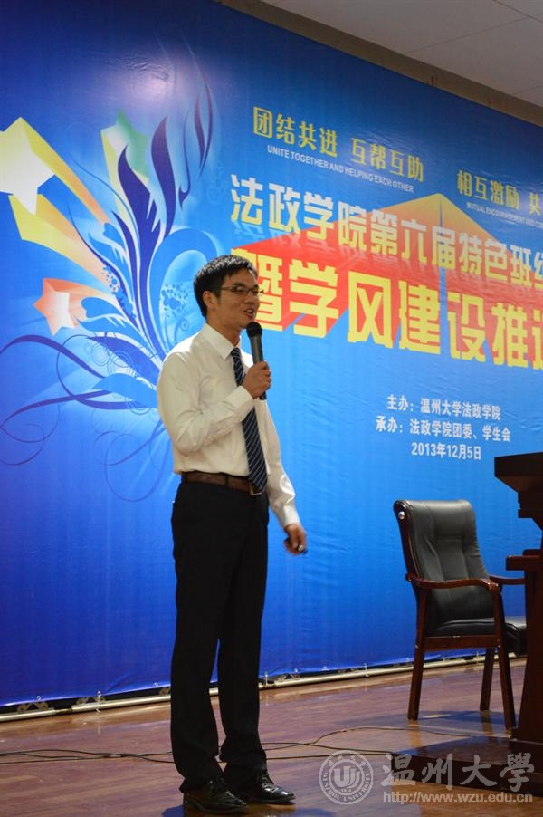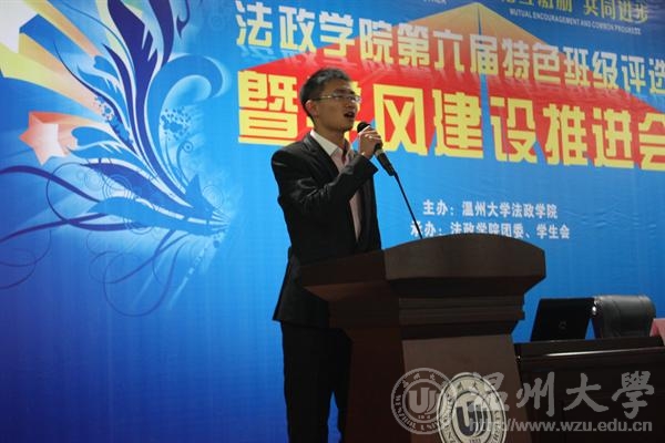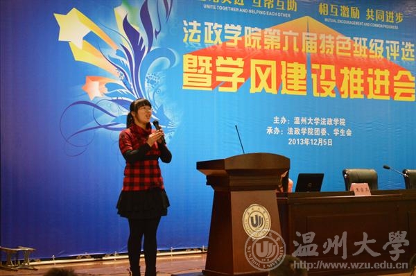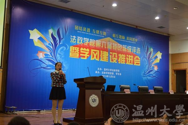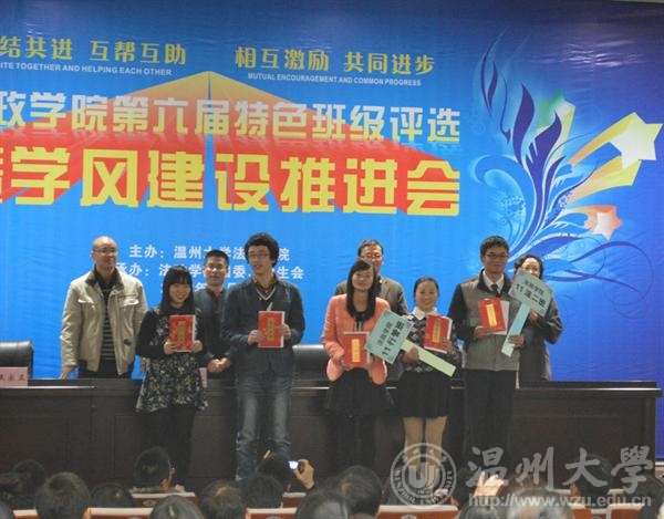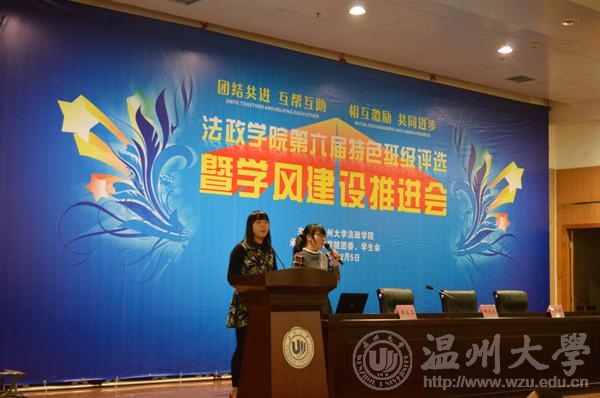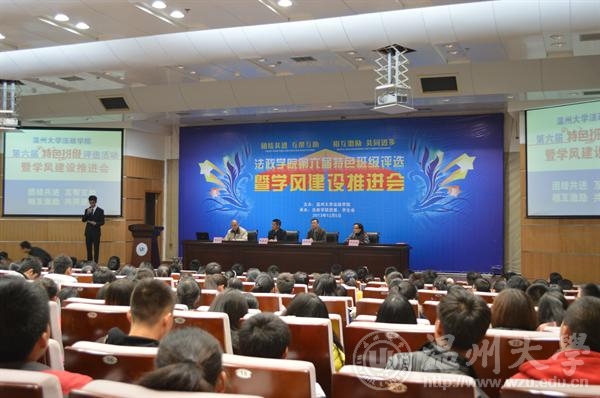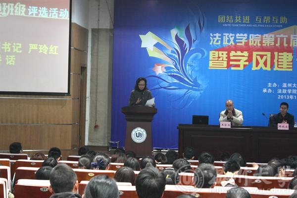 年12月5日晚法政学院第六届特色班级评选暨学风建设推进会在北校信息楼报告厅隆重举行。院领导钭晓东、王柏民、王宗正、严玲红、全体班主任和学生科老师、院团委和学生会主要学生干部、各班级学生代表参加了评选和推进会并现场观摩投票。