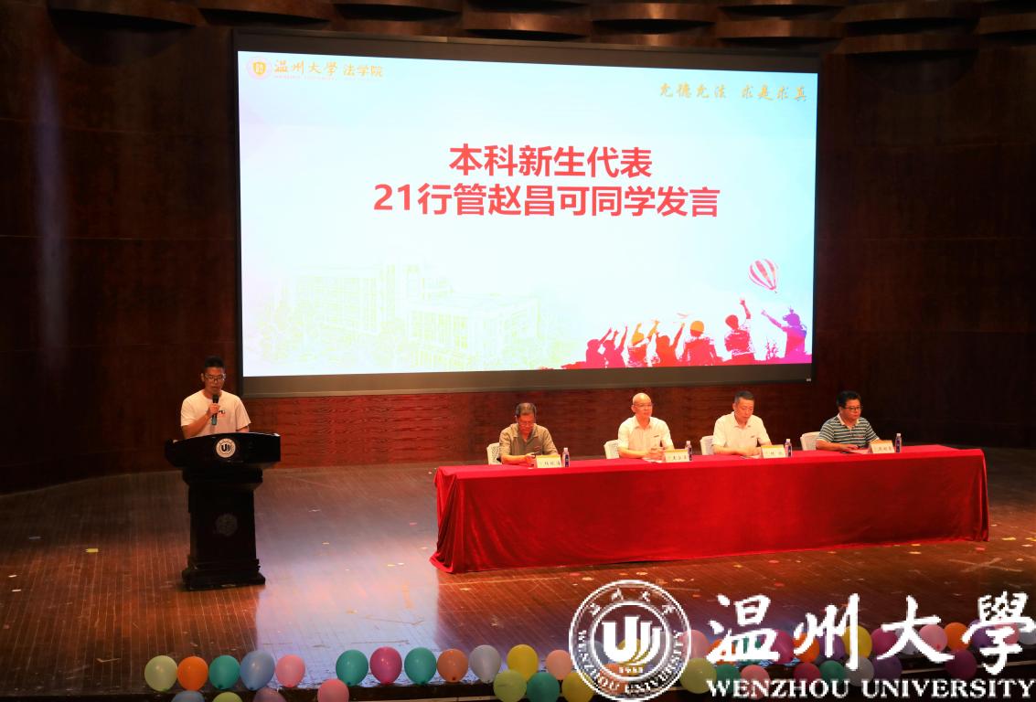 来自2021级法学2班的吴望真同学和2021级行政管理班的赵昌可同学作为新生代表依次上台发言,尽情展现了他们对专业学习的热情、对大学生活的向往与憧憬以及立志成才的决心,也倡议同学们专注研习学科知识,注重自身全面发展,牢记“求学问是、敢为人先”的校训,以高标准要求自己,拥有迎难而上的勇气和坚持奋斗的毅力,将“允德允法,求是求真”的院训,铭记于心,付诸于行。