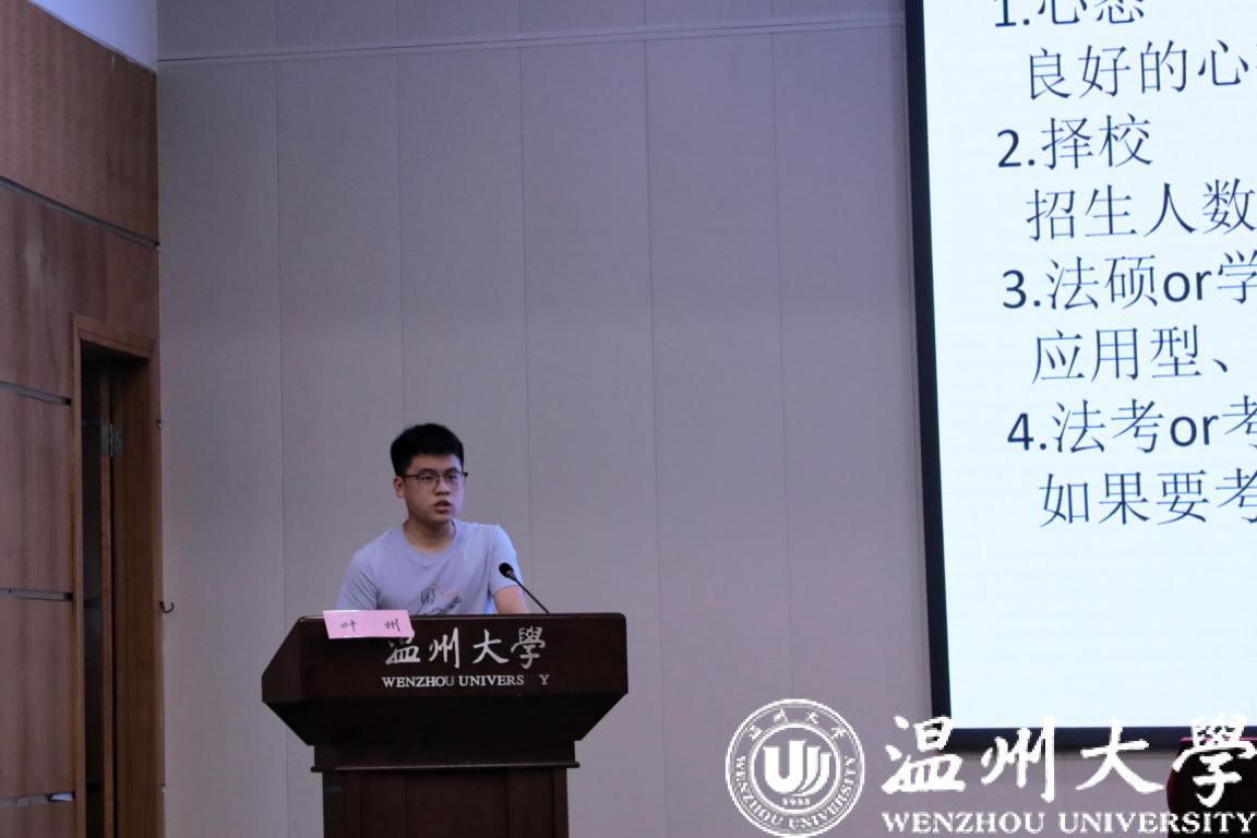 紧接着是进入杭州师范大学法硕的雷澳咪同学。对于同学们单考还是双考的问题她指出要综合考量,适于自身。在择校方面,要考察分数线和录取分数,做好准备。在时间安排上,要不求时长,不求速度,但求质量,在背诵时要注重结构,形成完整体系。