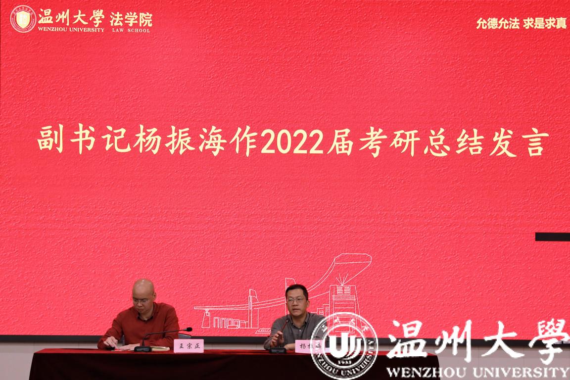 四位同学的分享以前人之经验给学弟学妹们树立了榜样,让立志考研的各位对考研有了更深入的了解,更清晰了自己的目标,更明确了如何科学备考。分享结束后,杨振海副书记作2022届考研总结发言。他公布今年的上岸人数以及考研人数,相较之前,充分肯定了同学们的努力。同时也代表学院对同学们表达充分关切。