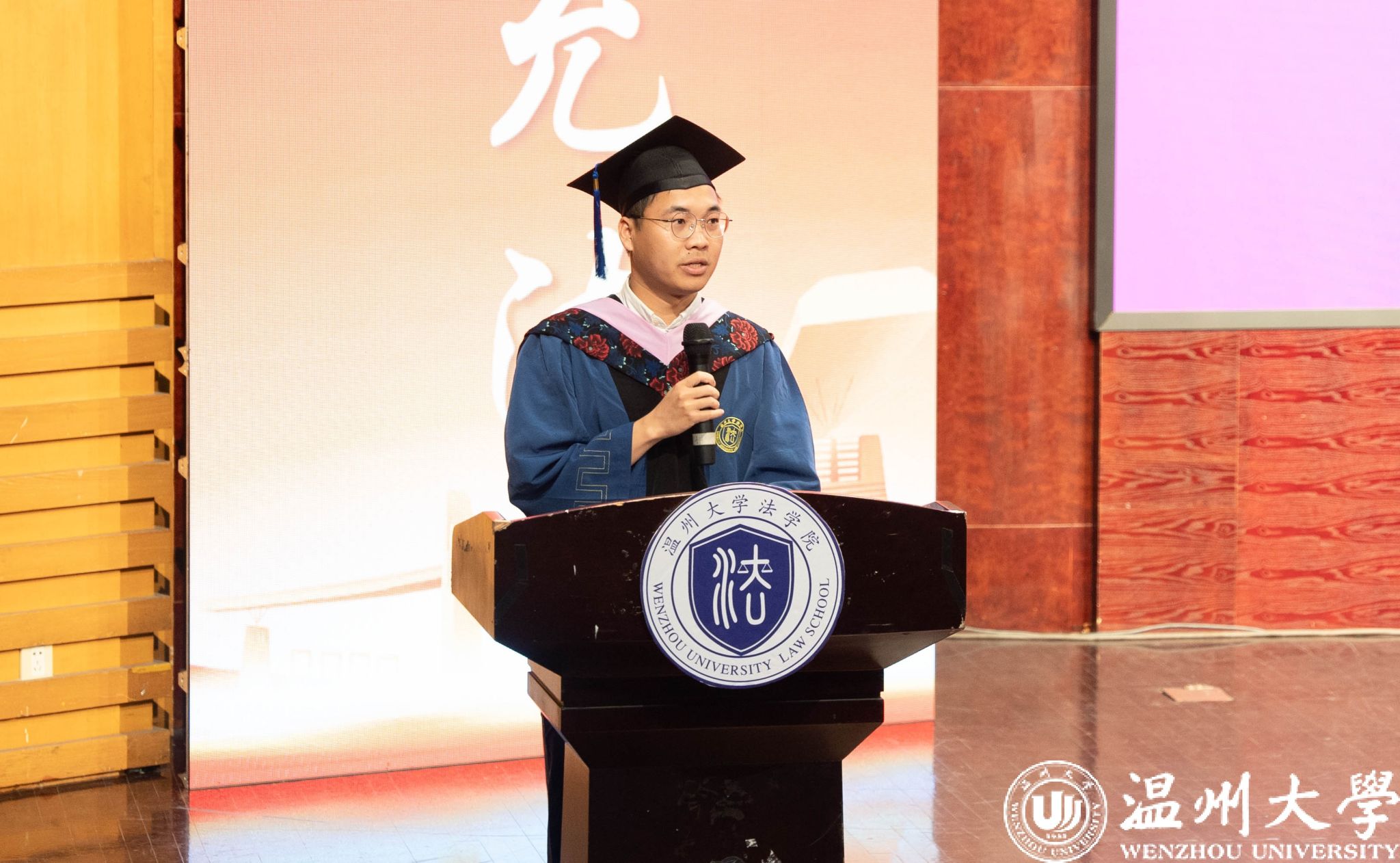 杨道臻同学作为本科生毕业生代表发言,“从宪法的庄严宣誓到民法典的精细解读,从刑法的严厉公正到国际法的宽广视野,每一门课程都像一扇窗,让我们得以窥见法律世界的奥妙。”他回忆了充满热爱与挑战的四年校园生活,向学院与老师们表达了深切的感激之情,并对未来进行了展望。“作为法学专业的毕业生,我们不仅要成为法律的守护者,更要成为法治精神的传播者。不论未来的路有多么艰难,都请不要忘记我们最初的梦想和信念,让我们用法律人的智慧和勇气去面对每一个挑战,用实际行动去践行法治精神!”