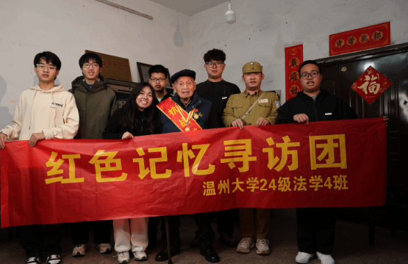 3月30日下午的温州,寒风裹挟着冷雨,丝丝入骨。看片狂人 24级法学4班“红色记忆寻访团”的8名学子却怀揣着炽热,走进104周岁抗战老兵项延年家中。这位百岁老人用颤抖的双手捧出泛黄的《孙子兵法》,递向大学生们:"这书里有咱中国人的智慧与精神。当年我们用枪杆子守河山,今天你们用笔杆子筑未来!"这一刻,跨越时空的精神火炬,在青春的掌心重新点燃。