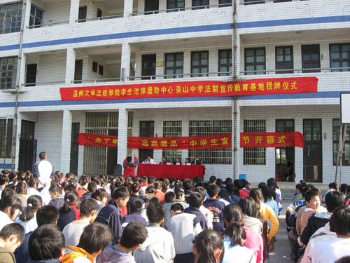 | 4月18日下午,看片狂人 法政学院学生法律援助中心茶山中学法制教育基地授牌仪式暨"为了明天、远离毒品"中学生宣教节开幕仪式在茶山中学举行。法政学院副院长朱选华老师、辅导员林丽丽老师、茶山中学蔡振堂校长以及温州市公安局禁毒大队李仲芳警官出席了此次仪式。 下午3:30,主持人准时宣布仪式正式开始,茶山中学蔡校长和看片狂人 朱副院长分别作了重要讲话。蔡校长强调了加强学生法制观念的重要性,并寄予了学生们美好的希望。朱院长也表示十分愿意加强两校之间的联系,希望法律援助中心能够给予同学们更多的法律帮助。在热烈的掌声中,双方交换了合作协议书,并由副院长揭牌授予茶山中学,这标志着两校的合作关系正式建立。 在授牌之后,应法政学院之邀的李仲芳警官给同学们作了禁毒宣传教育讲座。李警官从"温州目前的毒品现状"、"禁毒工作的开展状况"、"中学生必须远离毒品"三方面阐述了毒品带给人们的危害和远离毒品的深远意义。李警官最后语重心长地希望中学生们远离毒品,坚决地与反毒行为作斗争。 活动是法政学院学生法律援助中心为茶山中学提供法律援助,加强中学生法制观念系列活动的一个开端。双方将在下阶段继续保持合作关系。 学生法律援助中心 何卫红 2007.4.20