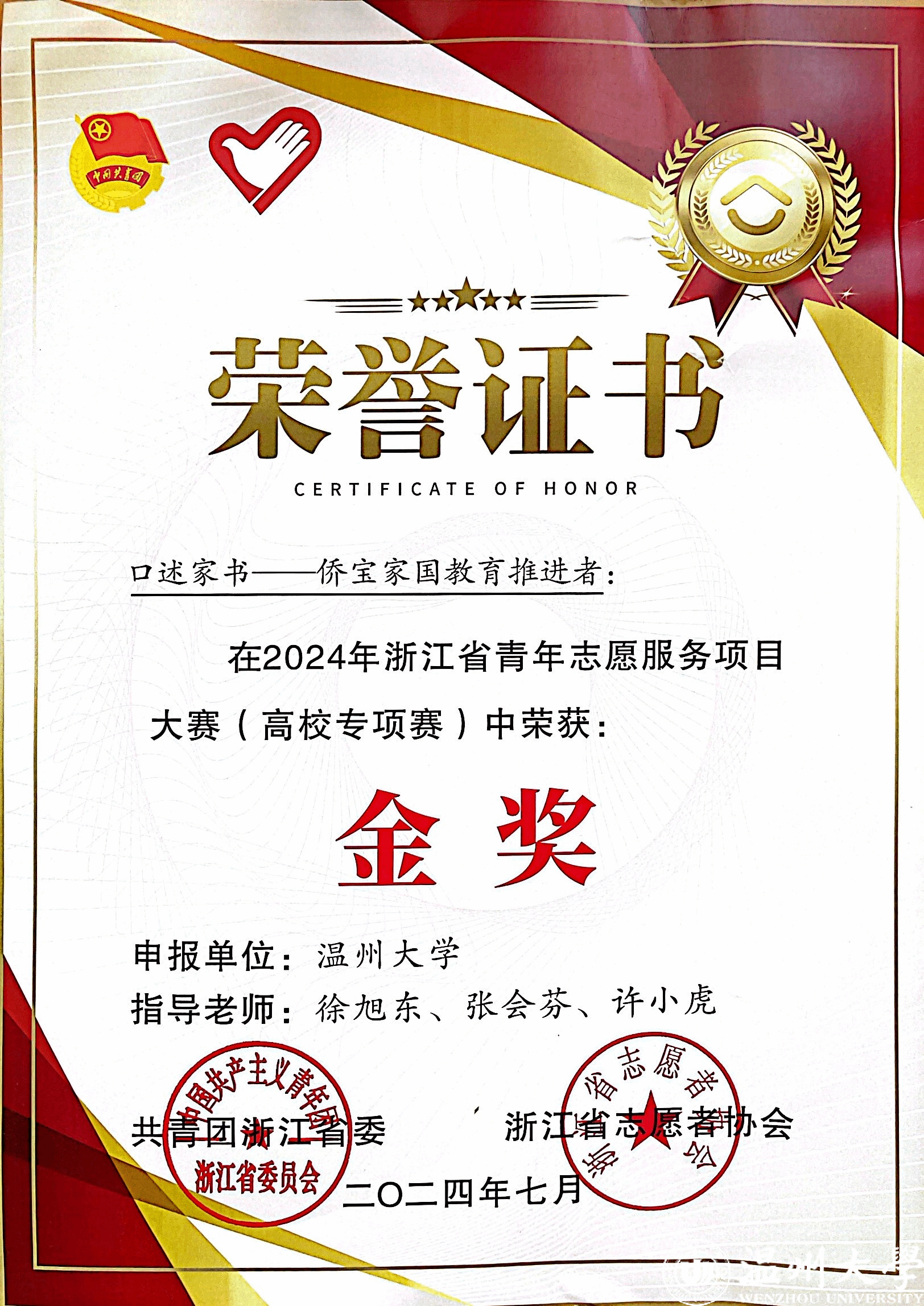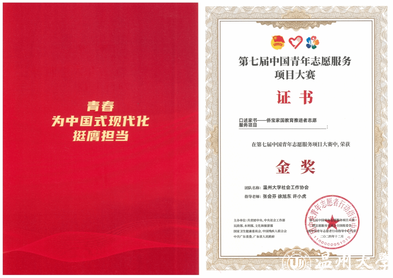 l 指导学生荣获浙江省青年志愿服务项目大赛(2024)金奖(全省第一);